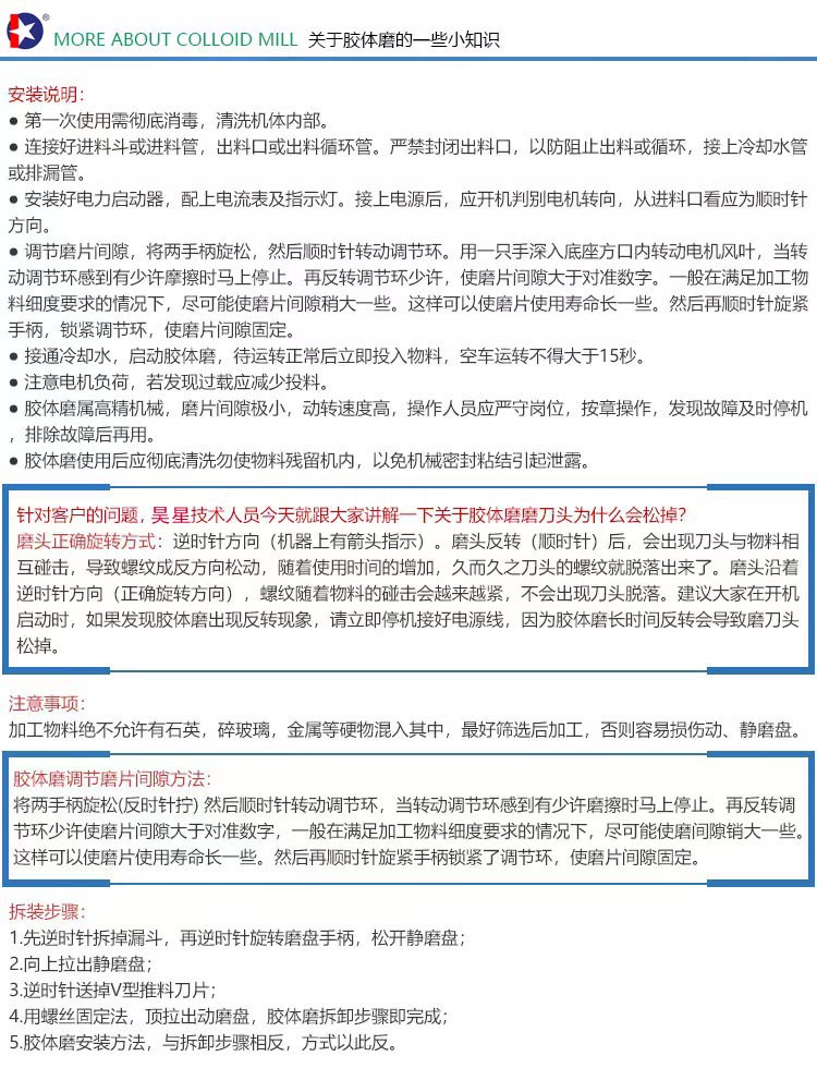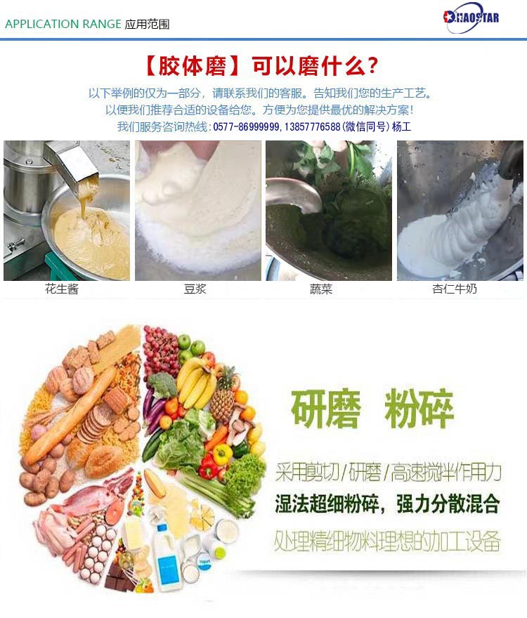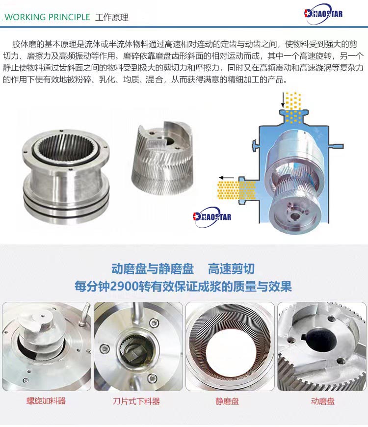 可代替并優(yōu)于石磨,砂磨機、球磨機、乳勻機、乳化機、三輥機、搗碎機等工作。亦可按照客戶對加工物料不同的酸度、堿度、濃稠度等性質(zhì)特殊要求定制生產(chǎn)。