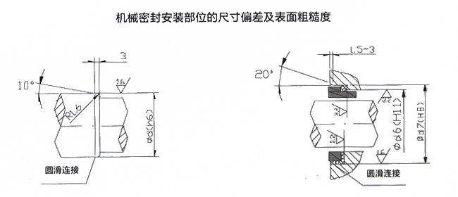 1、與機(jī)械密封所配軸和靜環(huán)座的尺寸公差、表面粗糙度和倒角過(guò)渡形狀見(jiàn)下圖;